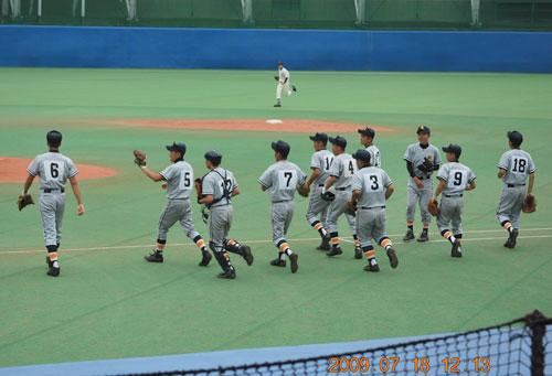 7月18日(土)高輪戦は、2年前の夏(2007年7月26日)ベスト8をかけて戦い、惜しくも敗れた因縁の相手です。9回表、沼田のあわやホームランというレフトフェンス直撃の三塁打で3-3の同点、一死三塁、ここで追加点を奪えば葛商の勝利間違いなし、というところまで追いつめながら延長10回エース堤が力尽きて4×―3と敗れました。