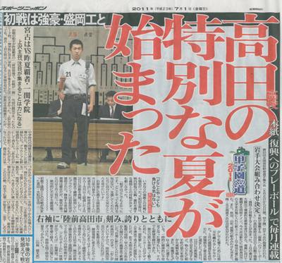 右袖に「陸前高田」と入れた新ユニホームで臨む。大和田主将は「どことやっても負けるつもりはない」と言う。作詞家の阿久悠さん(故人)は88年に高田高校が甲子園に出場し、8回降雨コールドで敗れた際、本紙連載「甲子園の詩(うた)」の中でこう書いた。「高田高校ナインは甲子園に1イニングの貸しがある」。震災は言い訳にしない。甲子園に貸した1イニングは今夏に返してもらう。
